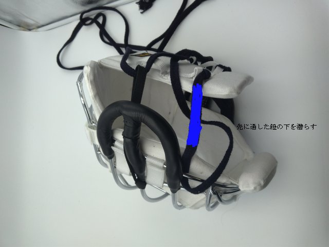 顎締め付け用の紐通し位置は下ほど面が抜けにくくなる。 |