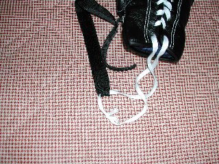 グローブ固定紐を適当な長さに切断して使用しないと打撃時に余った紐が顔面に直接当たる場合がある。 |