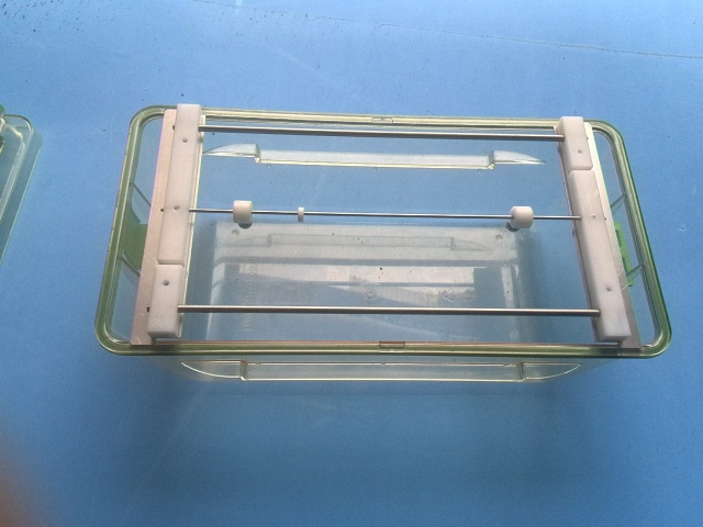 実用例 汎用飼育ケージに取り付けて動物が自由に歩ける様にする移動アタッメント 軸長を替えるれば各種サイズの飼育ケージに取付可能 最大幅 1m程度 取付はネジを締めるだけなので簡単 架 台 ジュラコン製 滑り軸 ステンレス製 架台・滑り軸は各種特注に対応します。 お問い合わせ下さい。 |